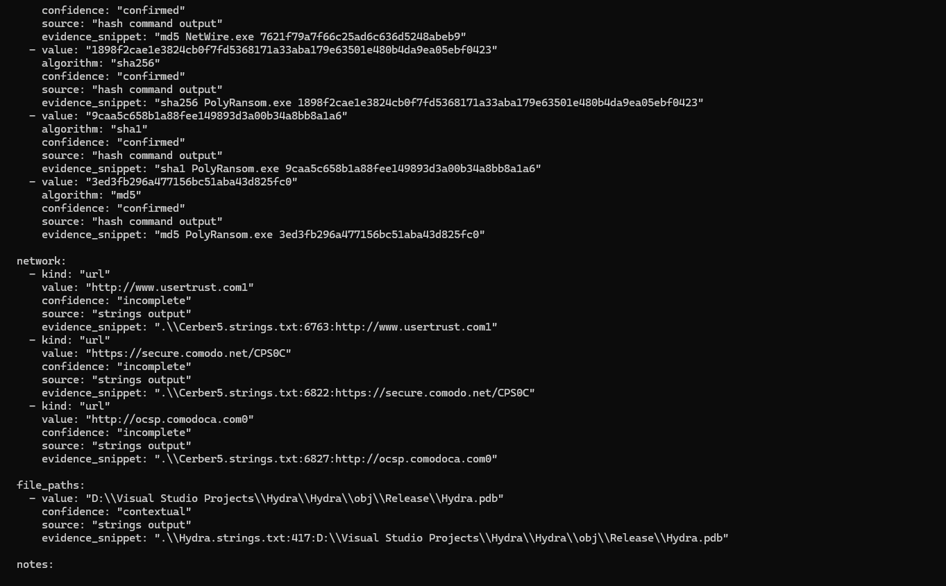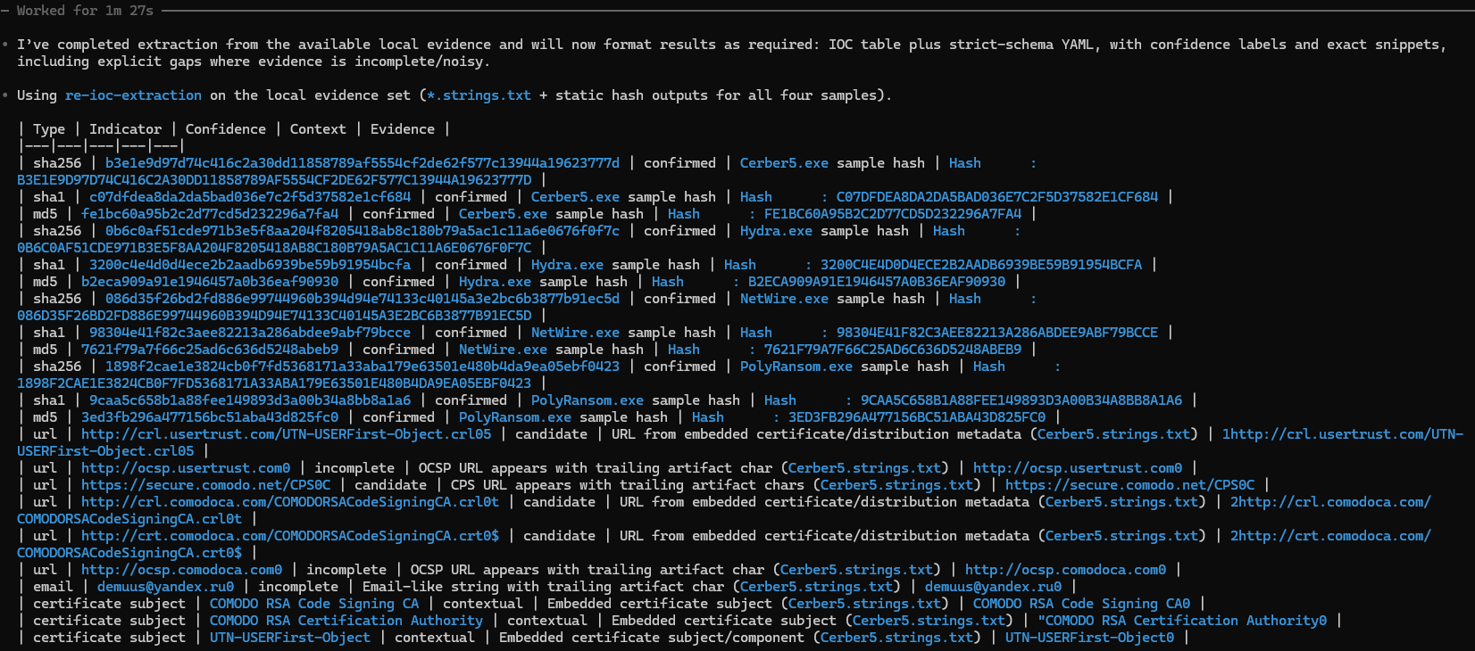 • Using re-ioc-extraction on the local evidence set (*.strings.txt + static hash outputs for all four samples).