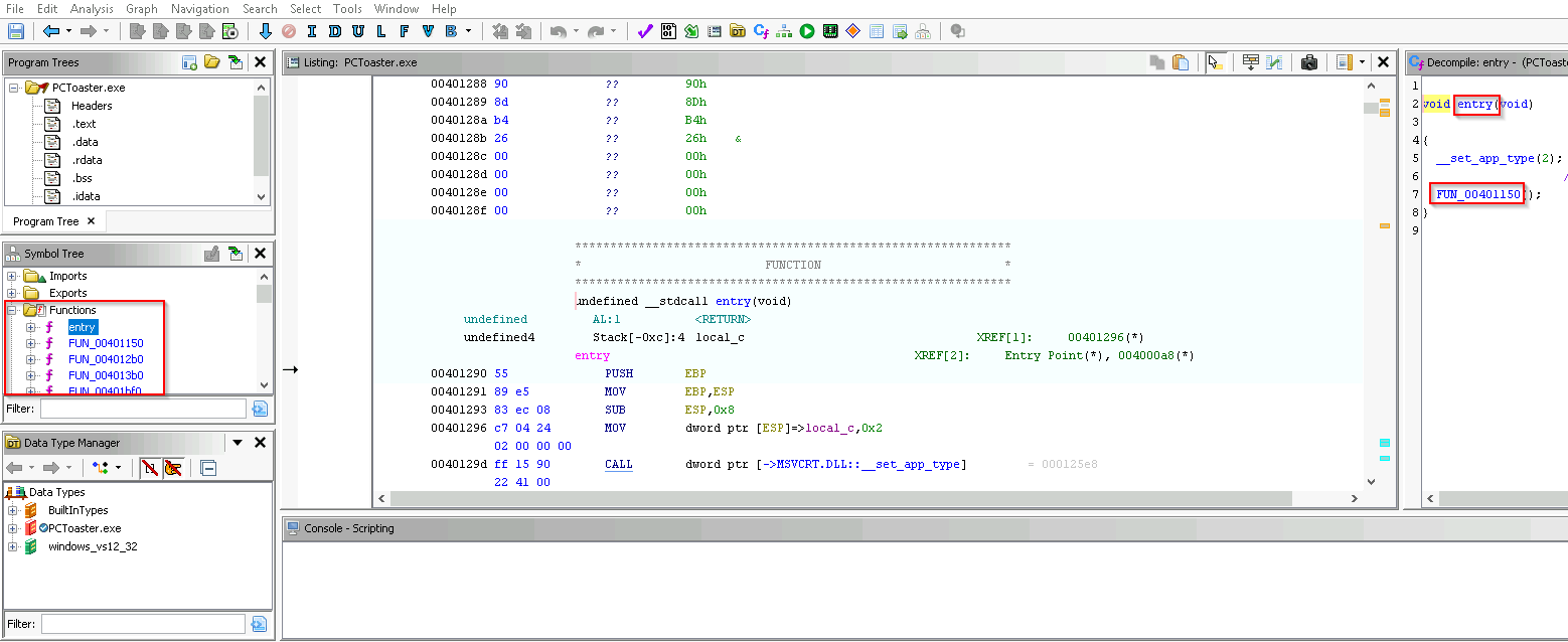 Additionally, the function names don’t really tell us a lot about what’s going on with the program. There’s generically named (prefixes of “FUN_” and the address they’re located at), which means they either didn’t have debugging information on during the time they were compiled, or the headers were proactively stripped after compilation.