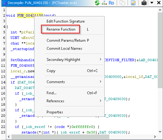 This will enable me to appropriately rename the function throughout the analysis in Ghidra as I’m examining the sample. In this case, this function looks to initialize additional functions as well as set up exception handling and passing command line arguments, potentially as a startup function.